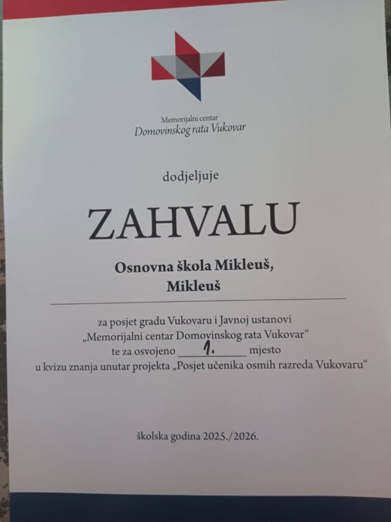 Prvi dan nastave (8.9.2025.) učenici 8. razreda krenuli su u ranim jutarnjim satima u Vukovar. Pri dolasku poslušali su predavanje “Domovinski rat”, a zatim obišli sve memorijalne lokacije. Nakon toga imali su obilazak MCDR Vukovar, ručak te Školu mira i kviz znanja na kojem su naši učenici Luka Dubaić i Borna Krupa osvojili za svoju školu 1. mjesto! Slijedio je obilazak Muzeja vučedolske kulture, Gradskog muzeja Vukovar te crkve Sv. Filipa i Jakova. Povratak je bio u kasnim večernjim satima. Učenicima je u pratnji bila razrednica Barbara Vidović Volenik koja ih pohvaljuje za lijepo ponašanje na terenskoj nastavi.